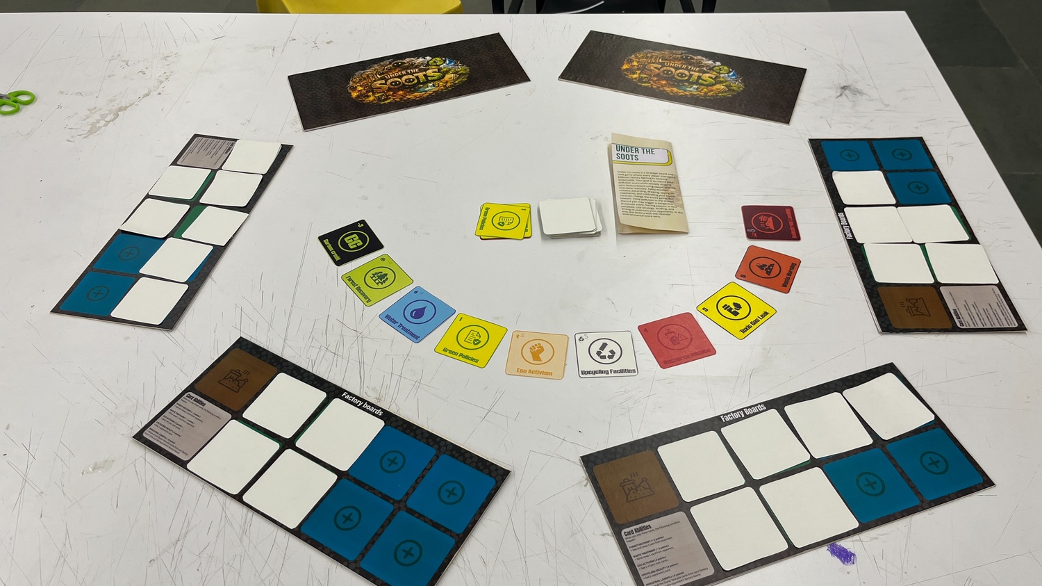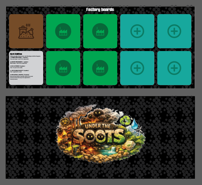Under the soots is a strategic board and card game where every player manages a polluted factory, fighting to become sustainable. Your goal is to reduce your pollution score while secretly shaping your factory board using swaps, abilities, and clever memory. Every decision matters, discarding, drawing, spying on opponents, and controlling your Dump Yard can change the entire game. But beware: rising pollution in the shared discard pile may trigger a dangerous threshold event, forcing players to face penalties. Use strategy, bluffing, and timing to outsmart your opponents. In the end, the factory with the cleanest environmental score wins.